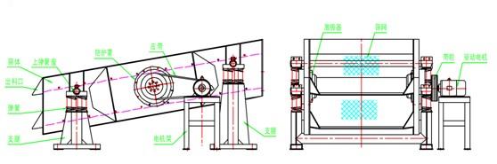 該系列篩機(jī)為座式安裝。篩面傾角的調(diào)整可通過(guò)改變彈簧支座位置高度來(lái)實(shí)現(xiàn)。